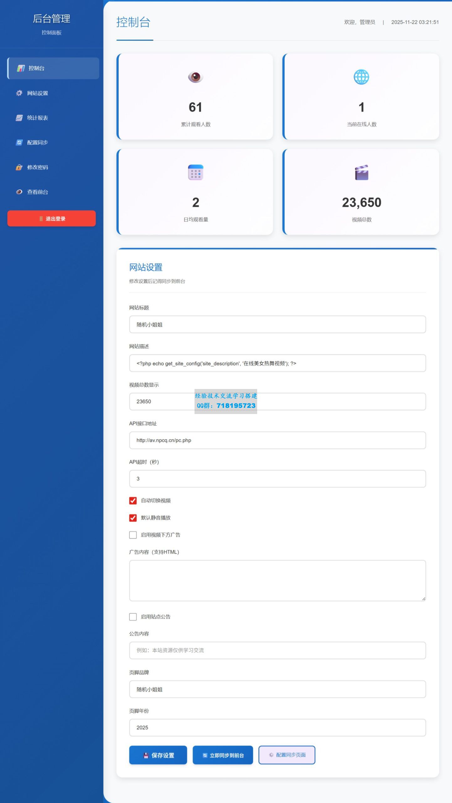 会员:浮舟 分享的 随机小姐姐热舞视频系统源码全新UI带后台版v5.0 自适应手机端更新日志:1.更新了后台功能,可以自行修改接口2.支持对外开放API接口功能,支持json和text格式输出3.修改网站信息,修改账号密码4.后台统计报 站外相关信息介绍