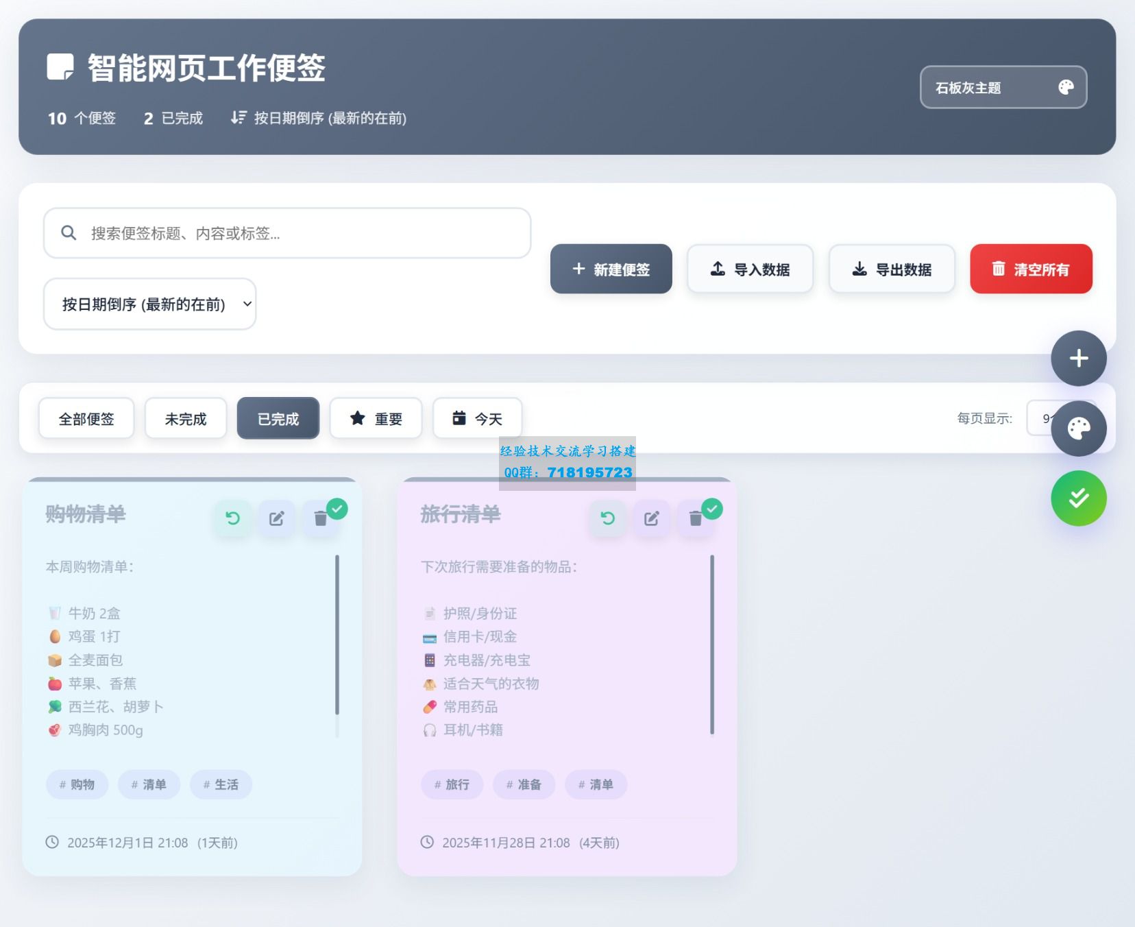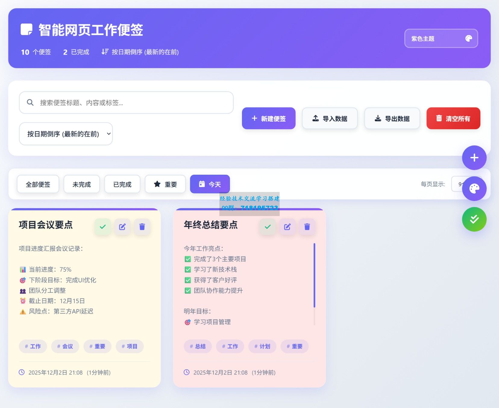 会员:小巧 分享的 html智能网页工作便签(简单、轻便、快捷) 功能说明便笺显示:默认设置便签按创建日期倒序显示(最新的便签在最前面)主题选择:支持消息通知(toast通知)红色主题 – 激情、活力,适合需要强调重要事项的场景青色主题 – 清新、科技感,适合程 站外相关信息介绍